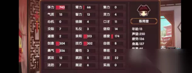 3、攻略该角色的属性要求为:声望、智力、魅力均大于700,技巧值大于600,臂力、自信、亲和、勇气、创意和口才则要达到500点以上,感受大于400点,气质属性要求比较低,只要达到300点即可。此外,最后的总好感度要大于25点,搬到南三所后还是要继续去拜访,并且一同触发刺客剧情。另外,工学课的课程等级需要大于30,安排行程中不得前往青楼。