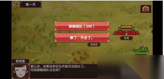 2、游戏在第4回合即可开启冒险模式,安排外出冒险的行程即可前往京城外的其他场景和镇子。想要前往远方场景,必须先提升马术课程,否则无法自己前往该场景,想要消耗200金钱跟随商队前去,且跟随商队还有概率遭遇马贼。