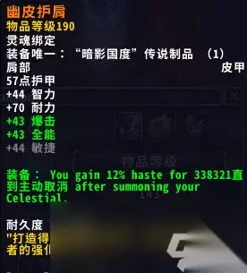 评测:装上后滚地翻的最大层数2层→3层,如果选择天赋“动如脱兔”可以使滚地翻充能最多达到4层,同样收益于真气突。些许增加武僧的爆发移动能力。 3.天神之悦 可选部位:头,肩膀 效果:当你召唤天神时,获得12%急速,直到主动取消。