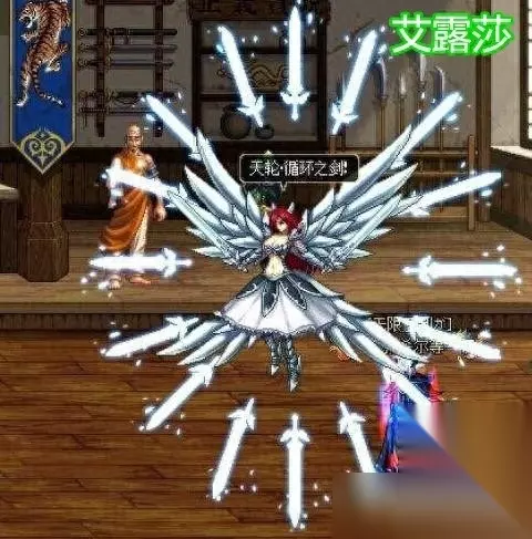艾露莎 这是【妖精的尾巴】联动礼包其中的一个宠物,由于她宠物特效特别炫目,使出天轮·循环之剑,漫天的飞剑就会攻击敌人。