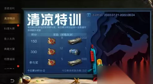 2、清凉特训:7月21日-8月4日,幸存者可以通过营地或快乐101参与匹配进入特训地图。在清凉特训中,幸存者仅可以使用水枪进行攻击,战斗到最后即为胜利。每日前2次参与可获得参与奖,每日累计积分到达一定程度时会获得额外奖励;