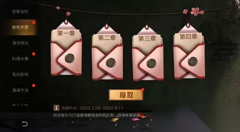 3、料理大赛:7月21日-8月11日,三系熟练度10级以上的幸存者可每日完成莫妮卡的指定任务获得奖励,烹饪莫妮卡给出的每日指定料理还可获得额外烹饪熟练度;活动期间,每天9:00-23:30,前往营地喷泉处,或101入口处,可以与莫妮卡对话,参与烹饪答题,答题后有机会触发神秘图谱礼包,帮助你解锁更多料理图谱! 4、玫色祈愿:7月28日-8月11日,幸存者可在集训入口内接取任务;任务每完成一定阶段,均可在界面中领取对应奖励;
