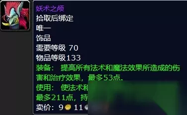 :饰品 :史诗 :拾取后绑定 :饰品 需要等级:70 物品等级:133 装备:提高所有法术和魔法效果所造成的伤害和治疗效果,最多53点。 使用:使法术和魔法效果的治疗和伤害提高最多211点,持续20秒。(2分钟冷却时间) :祖阿曼副本BOSS妖术领主玛拉卡斯(7.1%掉落率)。