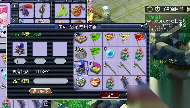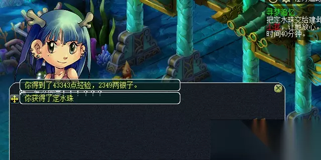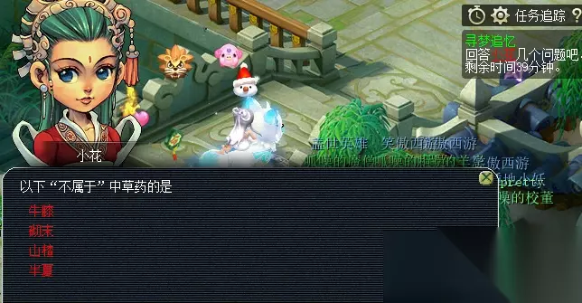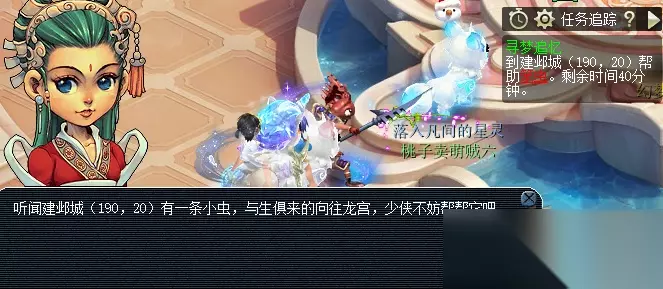 3.脱胎换骨 具体流程:到建邺城(190,20)帮助笼虫→队长累计答对小花三个问题后,方可完成后续任务,如遇难题可求助梦幻精灵或自行百度→需要点击笼虫对话,前往龙宫,途中必经一场战斗→到达龙宫后,点击笼虫,获得物品定水珠→重返建邺城,将定水珠给予小花。