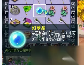 二、投放怪(成就共15点) 在活动期间的20:00、20:30以及21:00,系统通常会在大唐国境、朱紫国、江南野外、北俱芦洲、花果山投放梦妖、梦寐、梦魔,有兴趣组队前去挑战的玩家注意留意系统公告提示。 使用物品:幻梦晶 获得途径:每完成一轮寻梦任务后,队长百分百获得幻梦晶。 使用方法:切入与梦妖、梦寐、梦魔的战斗后,队长对其使用道具,一次即可。 使用效果:对梦妖、梦寐、梦魔使用后,该主怪均会在下一回合逃跑。战斗结束后,传送到相应的场景。 说明:不能放入行囊、交易,可叠加、丢弃。每周六的23:59回收该道具。 另注:没有幻梦晶也可击杀整点怪,但不会触发额外事件。