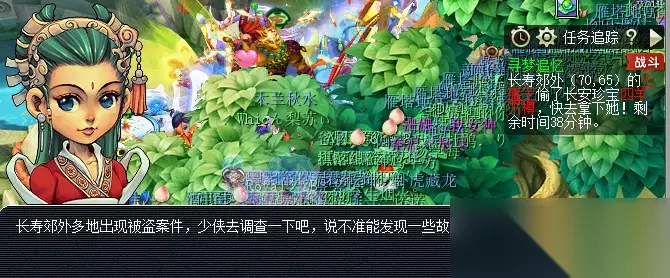 4.郊外缉盗(本环涉及2场战斗,随机一个队员会获得失心符巧计秘籍) 具体流程:前往长寿郊外(70,65)小雁子,切入战斗→战斗以小雁子逃跑结束,玩家可根据地面绿脚印或自行前往长寿郊外(165,105)小雁子奶奶处→切入第二场战斗→给予金疮药