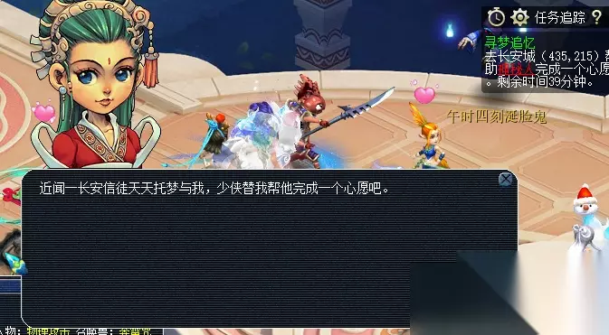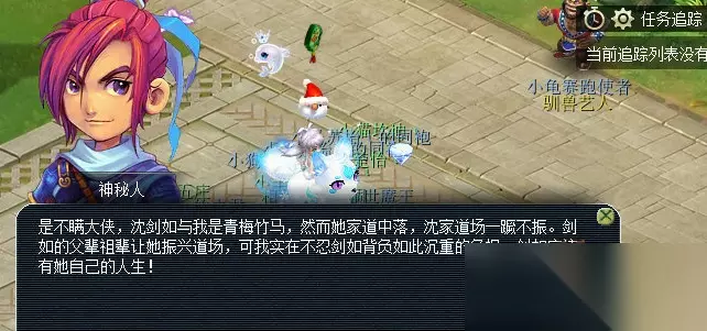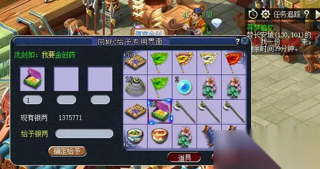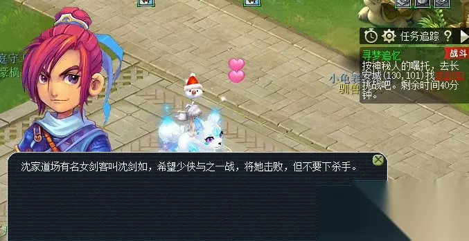 2.道场寻梦 具体流程如下:前往长安城(435,215)神秘人处→根据提示来到长安城(130,101)沈剑如,需战斗→战斗结束,给予沈剑如金疮药→重返神秘人处提交任务。