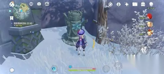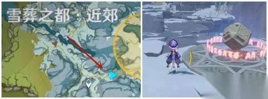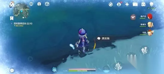 考虑到部分旅行者们的抗寒能力,这里推荐从最远端的漂流瓶开始拾取~ 这里要注意!宝物旁边总会有一些稀奇古怪的生物。什么拎着大盾的丘丘人,会呲呲激光的机甲…… 位置1