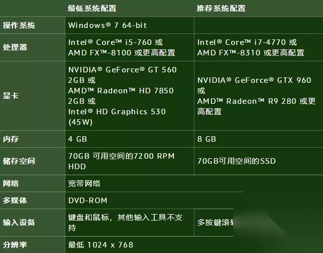 PC最低配置要求: 操作系统: Windows7/Windows8/Windows10; 处理器:英特尔奔腾D或AMD速龙64X2; 显卡:英伟达GeForce6800(256MB显存)或ATIHD3650Pro(256MB)orbetter; 内存:2GBRAM; 存储空间:3GB; 网络连接:需提供宽带连接; 输入设备:标准键盘鼠标; 分辨率大小:最小需为1280×720。 Mac最低配置需求: 操作系统:MacOS10.12; 处理器:英特尔酷睿2Duo; 显卡:英伟达GeForce8600MGT或ATIRadeonHD4850(512MB显存); 内存:4GBRAM; 存储空间:3GB; 网络连接:需提供宽带连接; 输入设备:标准键盘鼠标; 分辨率大小:最小需为1024×768。