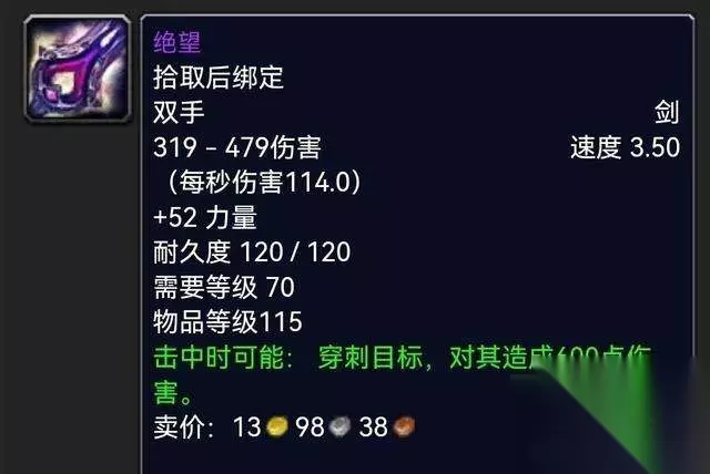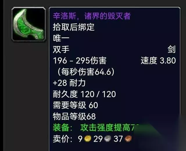很多人可能会把这东西和目前祖阿曼的金洛斯.末日的启示者搞混淆,其实这把辛洛斯.诸界毁灭者是出自于60年代祖尔格拉布经典BOSS哈卡。 喵叔的战士就为他的颜值所折服,索达的剑身镶嵌着熠熠生辉的祖母绿可谓夺人眼球,倒钩式的设计也是让你更加具备打击感,这把双手剑的长度来说真的只能用“诶呀......好长!”来感叹了。 那么目前深耕于TBC的你是否还记得哈卡这个BOSS如何打不?当年不会打的小朋友还是直呼好难的! 必肝指数:满天星辰直戳天花板,我**戳戳戳! 三:绝望