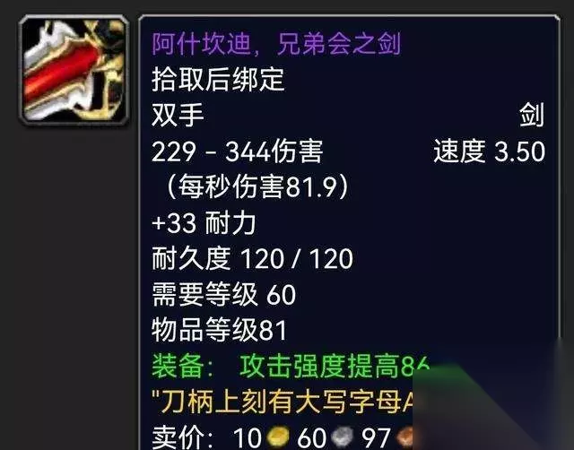 相对来说TBC初期卡拉赞金团歌剧院如果开出这把双手剑绝望那真的是绝望了,基本上没人要的东西,但是有爱的喵叔就亲切的和战士T说,拿了吧,你看看他颜值以后必定用得上! 战士T看了看果断100金拿下,瞬间团员对喵叔我刮目相看! 剑托处的镂空镶嵌了高贵的紫水晶可谓典雅的不行,修长的剑身搭配上深色系宝石的嵌入可谓NICE,而且这把东西很多玩家都容易忽略,我敢说你幻化他必然有很多正式服的萌新小朋友跪求出处。 必肝指数:10指狂戳天花板能量直击太阳系绽放万丈光芒亮瞎喵叔我这24K钛合金喵眼,哦......好疼,好疼! 四:阿什坎迪.兄弟会之剑