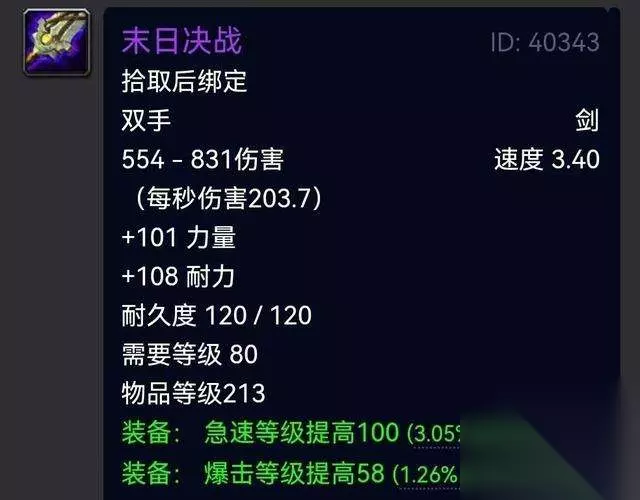 黑铁巨剑出鞘,敢问谁与争锋! NAXX飞到龙骨荒野之后我们玩家依旧不会放过他,简直就是追着打,让我们的克尔苏加德直呼设计师太坑。 四骑士出品的这把末日决战应该是幻化党对于双手剑的终极追求吧,当年喵叔我第一眼看到他的幻化的时候就很是卑微的求大佬告知了,然后默默的去肝! 那么对于末日决战这把武器你是否又中意呢? 必肝指数:恍然之间,喵叔已经抱住了我家天花板,戳了起来,我**戳戳戳!