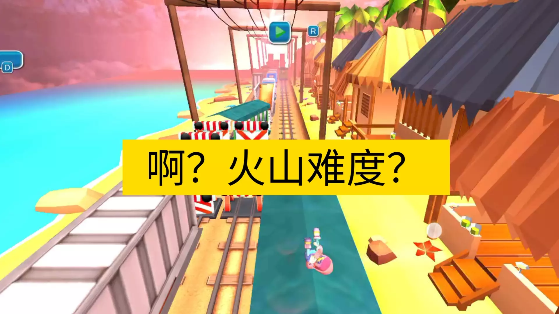 这是地铁跑酷火山难度Beta2.0版本的游戏展示,画面呈现了游戏内角色在轨道场景跑酷的过程,还有游戏的设置选项与进入须知,该版本有特定的游玩规范。