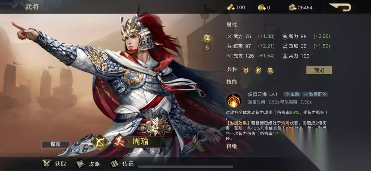 周瑜 御值:6御 大都督的技能效果是对敌人全体发动高伤害智力攻击,若目标处于灼烧状态则伤害翻倍,否则有一定几率使目标陷入灼烧状态,周瑜的面板属性高,技能又实用,可搭配专门的灼烧队和吴国军师队增加伤害,可谓是最强军师了。
