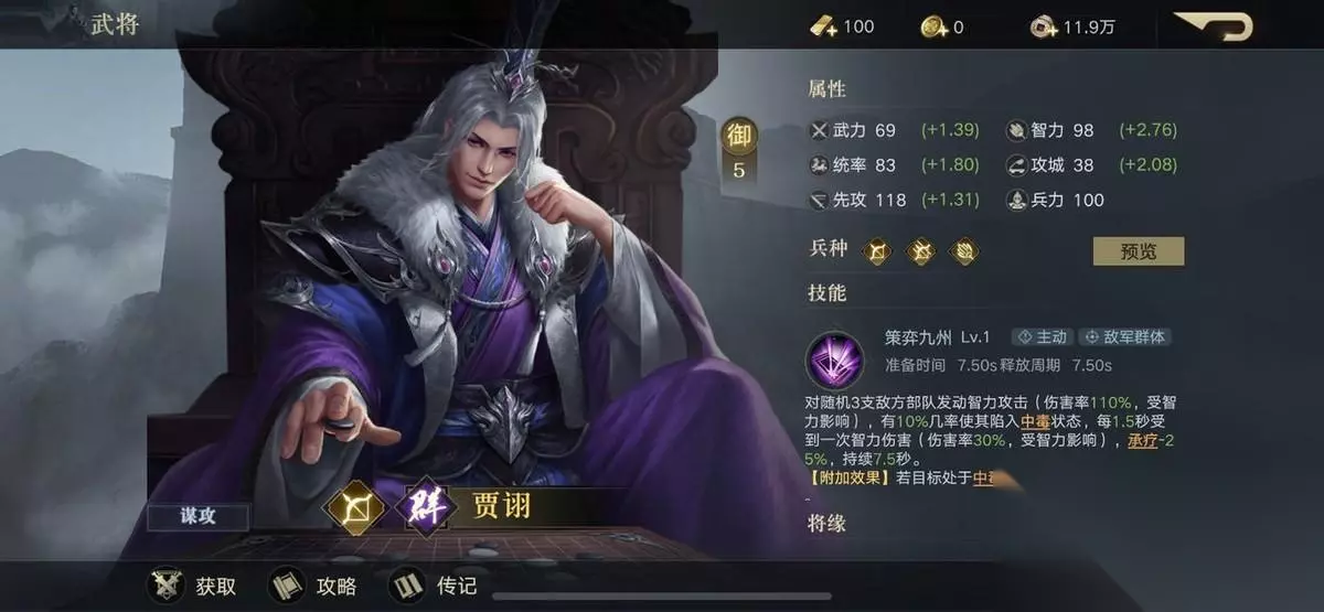 贾诩 御值:5御 技能是对随机的3支敌方部队发动高伤害智力攻击,有几率使其陷入中毒状态,每一段时间受到一次智力伤害并附带减少承疗的效果。若目标已经处于中毒状态,伤害还能增加。贾诩本来就被称为三国第一毒士,在游戏中也贴切的反应了这一点,中毒看起来效果较低,但累积伤害高且没法相应的治疗。贾诩的面板属性高,可以担当毒伤队伍的核心。