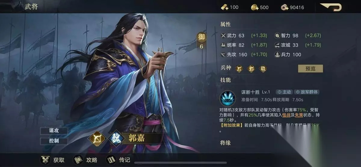 郭嘉 御值:6御 技能效果是对随机的3支敌方部队发动智力攻击,并有几率使其陷入失策和怯战状态,若自身智力高于目标,几率还能更加提升。面板属性高,技能在高输出的同时还能兼具极强的控制作用,也让郭嘉成为游戏中顶尖的谋士。
