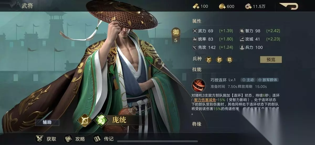庞统 御值:5御 技能是对敌方随机3支敌方部队施加连环状态,,该状态下智力伤害减免变少,处于连环状态的部队在受到伤害的同时,其他处于连环状态的部队也会受到一定比例的伤害攻击。变相的群攻技能,加上庞统本身的面板属性不错,所造成的总伤害也非常可观。