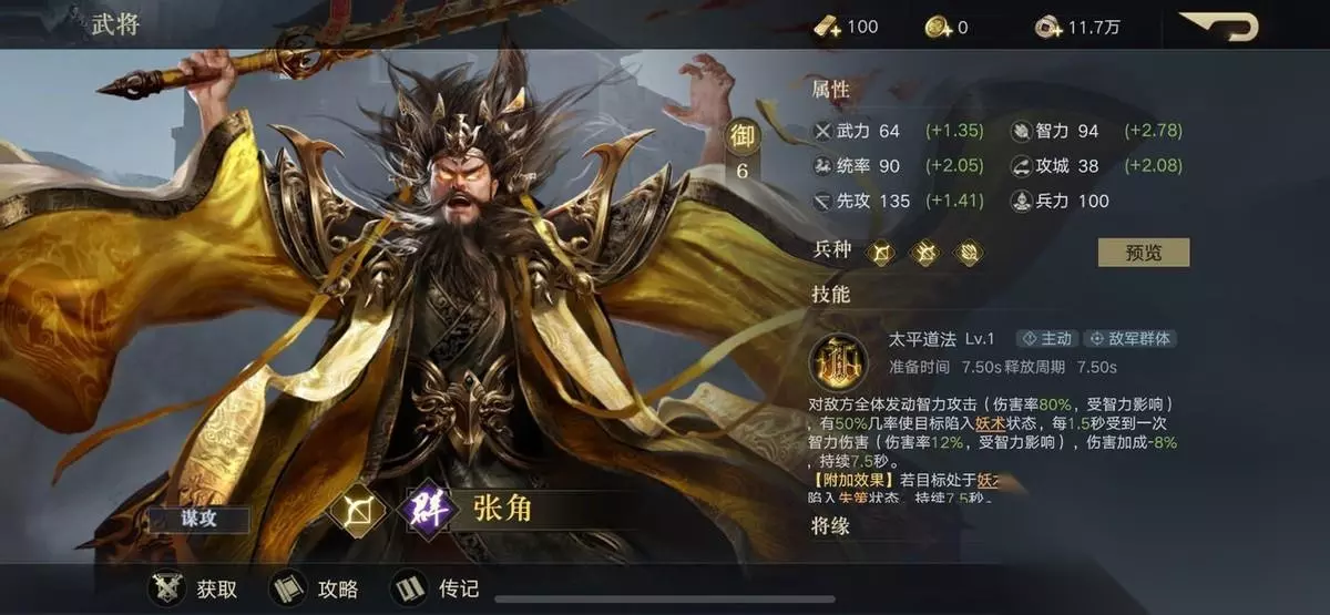 张角 御值:6御 技能是对敌方全体发动智力攻击,并有几率使目标陷入妖术状态,在受到周期伤害的同时还有几率陷入失策状态。和周瑜的火攻,贾诩的毒攻相比,张角的妖术显得伤害稍弱一点,但控制效果更好,张角本身的面板属性也还不错,伤害一样非常高。