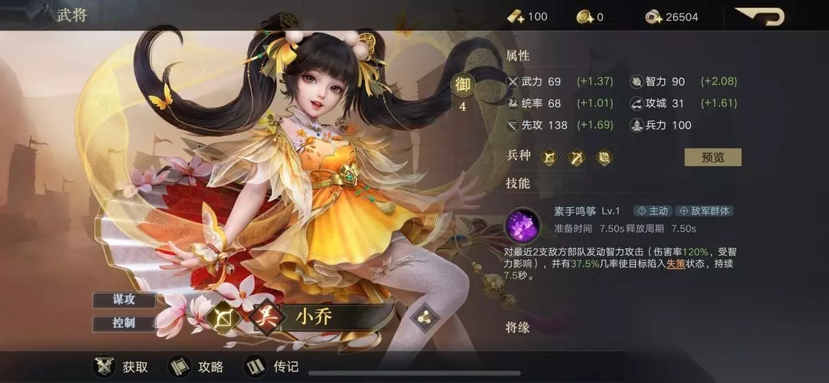 小乔 御值:4御 技能是对最近的2支敌方部队发动高伤害智力攻击,并有几率使其陷入失策状态一段时间。御值低,适应性高,可全剧本通用,特别是有周瑜在场的同时带上小乔可以让伤害更上一层楼,同时小乔技能还附带控制作用,也让她的泛用性更高。