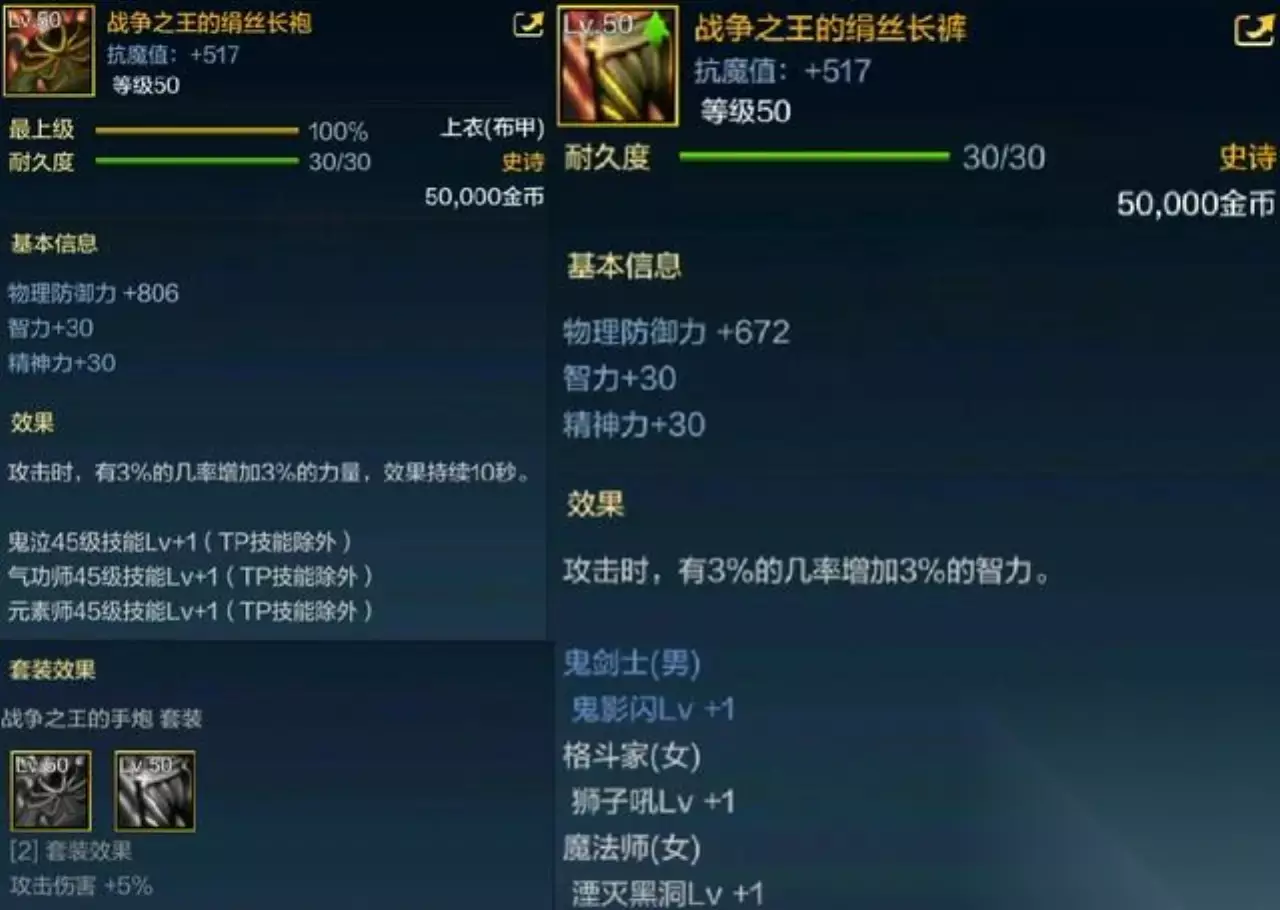 【战争之王布甲】 如果大家玩过以前的版本,对战争之王应该是很熟悉的,这是55级的神器级别装备,但是在手游却升级为50级的史诗装备,属性也有所不同。 端游上衣和下装的属性都是增加了布甲职业技能等级,上衣是45级的技能,并且是增加2级的,而手游中的上衣只增加了一级,因为手游职业少,所以只描述了3个布甲职业的,同时还有3%的几率增加力量;下装鬼影闪、狮子吼、湮灭黑洞这三个技能在端游是2级,手游也改为了一级,但是拥有3%的几率增加3%的指令。 至于套装属性,端游是2%的几率增加30点的力量和智力,手游2件套的属性是5%的黄字伤害。总体来说,手游在升级史诗后,总体的伤害属性比端游神器阶段更强。
