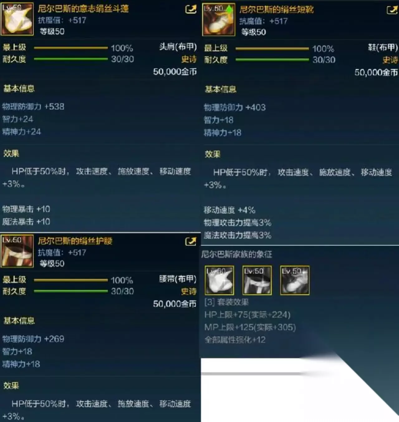 【尼尔巴斯的意志】 这一套也是55级神器装备,没想到手游又- -次做成了史诗装备,并且是三件套属性的装备。 端游头肩是50%的HP以下增加2%的三速, 并诅每减少10%则额外提升2%,最高可以提升10%,手游则是3%的三速和10点双暴 鞋子端游是50%HP增加15点力量和智力,每减少10%提升15点, 最高提升75点,手游则是3%的三速提升和3%的物理攻击力和魔法攻击力提升 腰带端游提升的是三速,手游也是一样的三速提升 套装端游没有,手游则有12点的全属性强化。 DNF手游攻略大全 内测激活码 公测时间爆料 职业加点大全 韩服安装教程 职业大全 转职加点 深渊副本 附魔大全 NPC汇总 宠物大全 新手攻略 材料价格