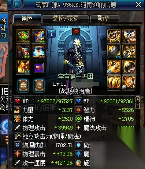 第二个弹药,走的是魔法流派,跟第一个截然不同,全身增幅的是智力。这位弹药,手拿的并不是步枪,而是一把手弩,而起站街的智力面板5526,魔攻7W1,双防达到白字百万的程度。与物理流弹药一样,其一身的装备,都是高强红字。不过,从其智力面板打造上来看,并没有物理流弹药强势。
