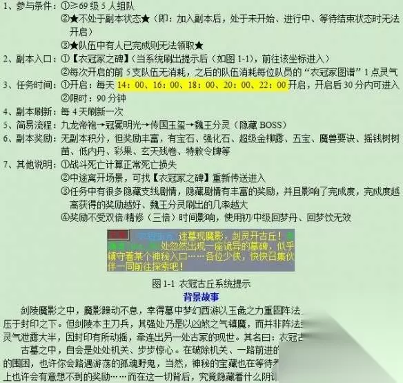 梦幻西游衣冠古丘副本攻略 副本要点 隐藏怪物首领| 刷新坐标 | 奖励 | 难度 | 答题 | 刷新时间 精灵问答 1、参与条件: ①≥69级,5人组队 ②不处于副本状态(即:加入副本后,处于未开始、进行中、等待结束状态时无法开启) ③队伍中有人已完成则无法领取 2、副本入口: ①【衣冠冢之碑】(当系统刷出提示后前往该坐标进入) ②每次开启的前5支队伍无消耗,之后的队伍消耗每位队员的“衣冠家图谱”1点灵气 3、任务时间: ①开启:每天14:00、16:00、18:00、20:00、22:00开启,开启后30分内可进入 ②限时:90分钟 4、副本刷新:每 4天刷新一次 5、简易流程:九龙帝袍一冠冕明光一传国玉玺一魏王分灵(隐藏 BOSS) 6、副本奖励:无副本积分,但奖励丰富,有宝石、强化石、超级金柳露、五宝、魔兽要诀、摇钱树树苗、低内丹、彩果、玄天残卷、特赦令牌等 7、其他说明: ①战斗死亡计算正常死亡损失 ②中途离开场景,可找【衣冠家之碑】重新传送进入 ③任务中有很多隐藏支线剧情,隐藏剧情有丰富的奖励,并且影响了完成度,完成度越高获得的奖励越好、魏王分灵刷出的几率越大 ④奖励不受双倍,精修(三倍)时间影响,使用初/中级回梦丹、回梦饮无效