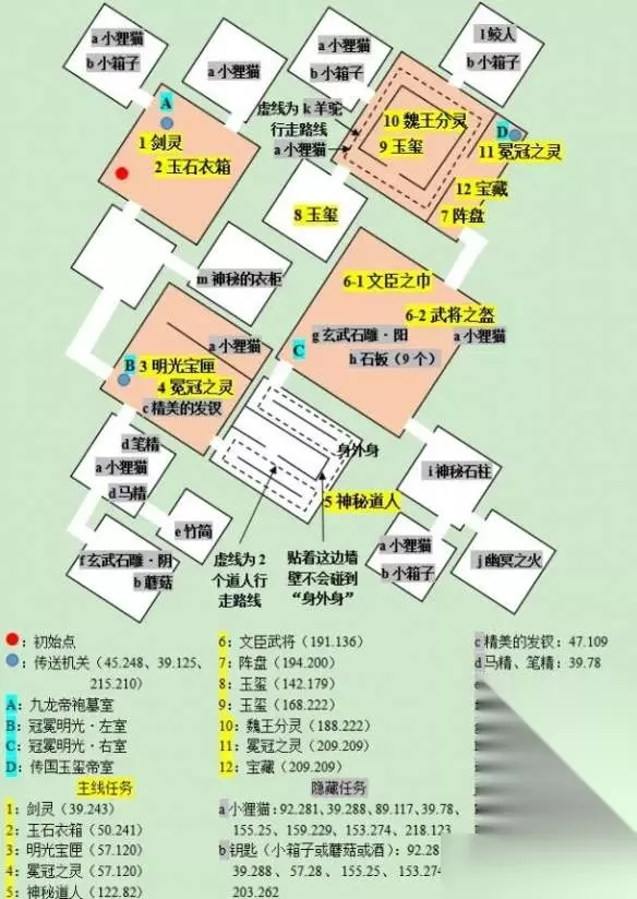 16、前往(205.25)将“精美的发钗”投入到【幽冥之火】中完成任务; 17、回到【神秘石柱】所在副室后前往(155.25)概率遇见:小狸猫、小箱子、蘑菇、酒; 冠冕明光·左室(主墓室 B) 主线任务 18、飞出去点【衣冠家之碑】重新进入找【传送机关】传送至“冠冕明光·左室”; 19、前往(60.117)点【冕冠之灵】获得【破魔灵玉】; 20、前往(122.82)点【神秘道人】战斗;
