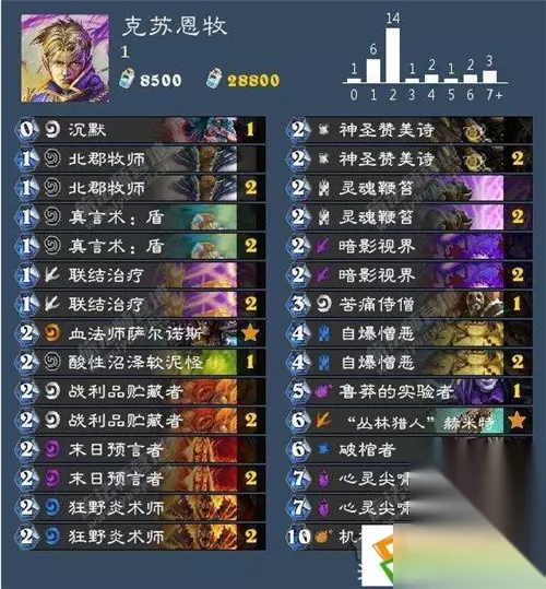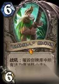神圣赞美诗: 2费所有友方角色恢复6血,相比治疗之环,有利有弊,如何取舍小伙伴自己抉择。赞美诗的好处是不仅奶量高,还排除了给对手随从回复的负面效果,而且可以给英雄回复6血,利于苟活。治疗的环的好处是0费就可以打,非常灵活,而且配合北郡、炎术士的话,给对手奶的负面效果反而会变成正面的,能为我们提供更多的手牌资源。故选择不唯一。 小软: 武器肆虐→软泥怪横行→武器减少→软泥怪减少→武器肆虐……环境一直处于这样的死循环中,而如今则是又回到了武器肆虐的时期,所以又得掏出软泥怪针对了,特别是术士的堕落者之颅和德鲁伊的嫩枝,以及法师的艾路尼斯这几把武器,如果能成功摧毁,那么就可以为我们减小术士的场面优势,以及降低法师的输出能力,减缓德鲁伊的OTK节奏,为我们争取更多时间,胜算就更高。 对阵思路: 对阵快攻起手找北郡、盾、末日、血法、苦痛、灵魂鞭笞、战利品等低费卡,有末日优先扔末日,3费先手很重要,然后就是利用战利品、苦痛过牌,如果有战利品和血法,优先扔战利品,站场能力强。且血法有额外用途(配合灵魂鞭笞,故入场优先级降低),而除了这些站场解场组件,最重要的就是丛林猎人了,可以加快我们的节奏。心灵尖啸一波清场,然后抽齐组件带走对手。 对阵控制卡组时,起手同样找过牌的北郡、盾、战利品、血法、苦痛以及丛林猎人,另外就是心灵尖啸或者暗影视界,有这些卡的话,只要对手不是特别激进,我们就有绝对的优势可以碾压对手,思路很简单,不停过牌,然后丛林猎人一波摧毁大部分牌库,那么几回合之内就可以完成斩杀了。