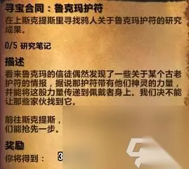 这第一步任务就够各位玩家找上一会,来到任务区域后首先是要求我们寻找5个研究笔记,这些笔记是位于地图蓝色任务区域内随机刷新,而刷新数量少的可怜,要是同时做任务人太多,你可就要找上一会了。 鲁克玛护符:第一把钥匙