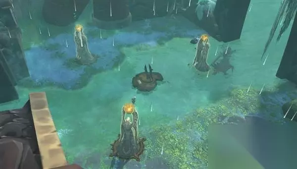 沿着河流往下走,就会看到这样一个装置,把三个雕像的正面转向中间。激活后,点击石板。