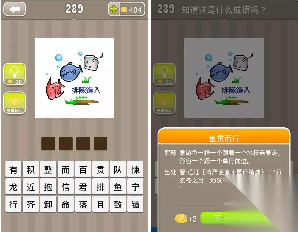 成语猜猜看鱼排队穿过水草打一成语。鱼排着队穿过水草这是什么成语呢?那不知道的玩家不妨进来看看答案。
