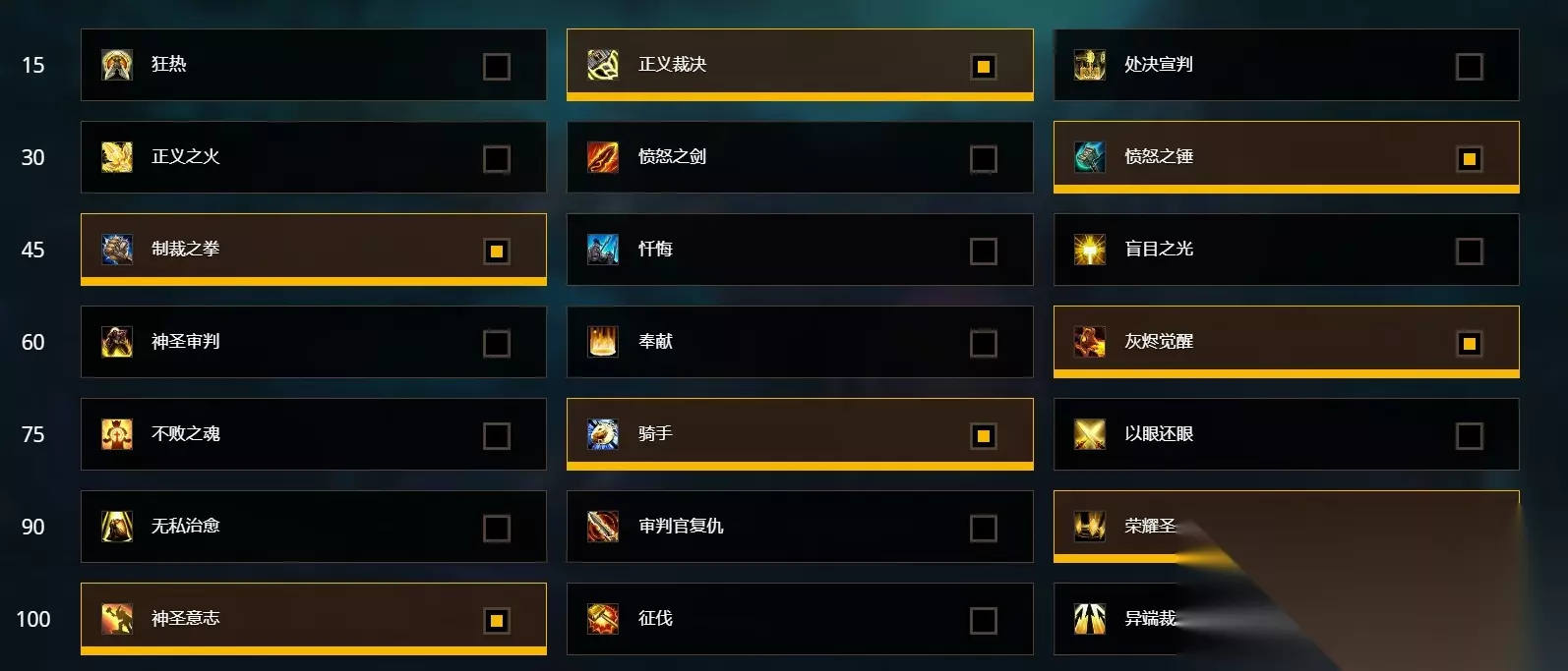 15:正义裁决 30:愤怒之锤 45:制裁之拳 60:灰烬觉醒 75:骑手 90:荣耀圣令 100:圣神意志 以上为团本天赋