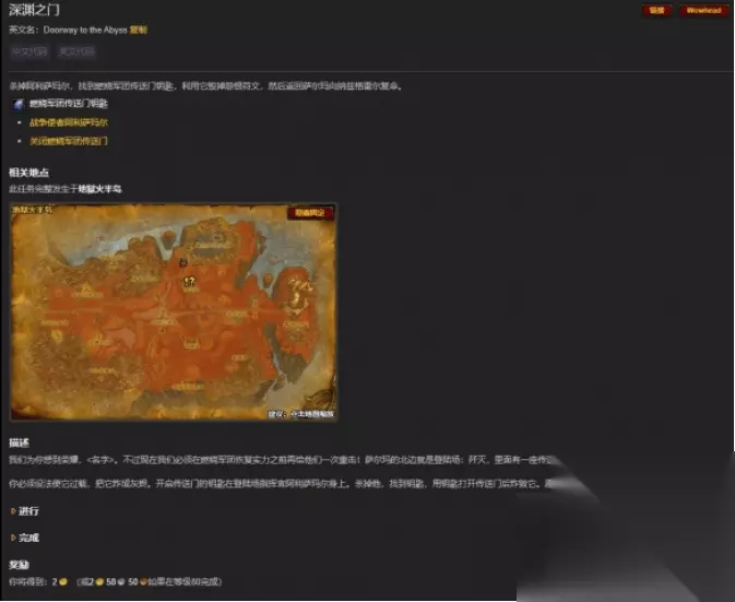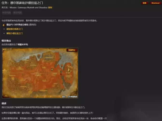 任务5:消灭燃烧军团 前往地狱火半岛58,41处,与斯古尔·碎颅者中士对话,接受任务。 杀死指定数量的唤火小鬼、地狱火战争使者和恐惧召唤者,完成任务。 任务6:魔火峡谷 在地狱火半岛东北方向找到任务NPC机甲残骸前线指挥官托尔克(65,43),接受任务。 在东北方向(右上角)寻找并消灭唤火小鬼、地狱火战争使者和恐惧召唤者。 任务7:阻断援军 寻找两个传送门的位置,分别位于地狱火半岛70,45和74,38处。 任务8:穆尔凯斯和沙德拉兹之门 完成阻断援军任务后,由空军指挥官布拉克提供任务。 搭乘双足飞龙完成轰炸任务,摧毁两个传送门。