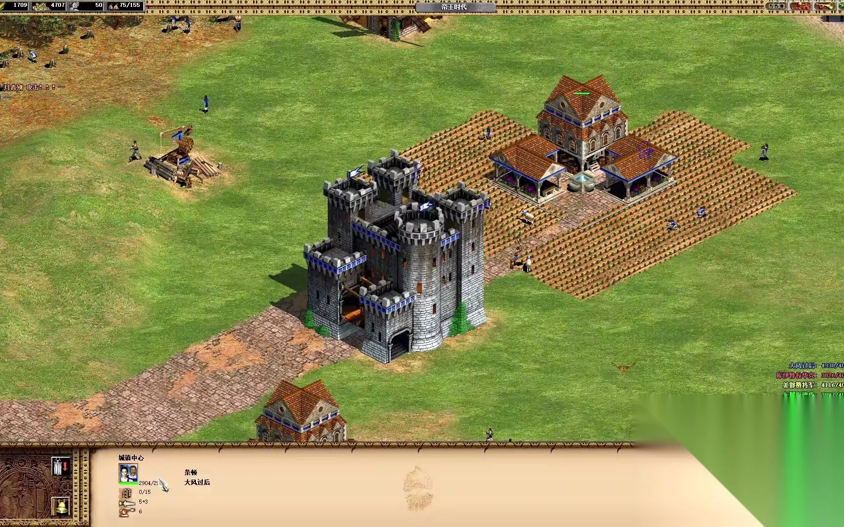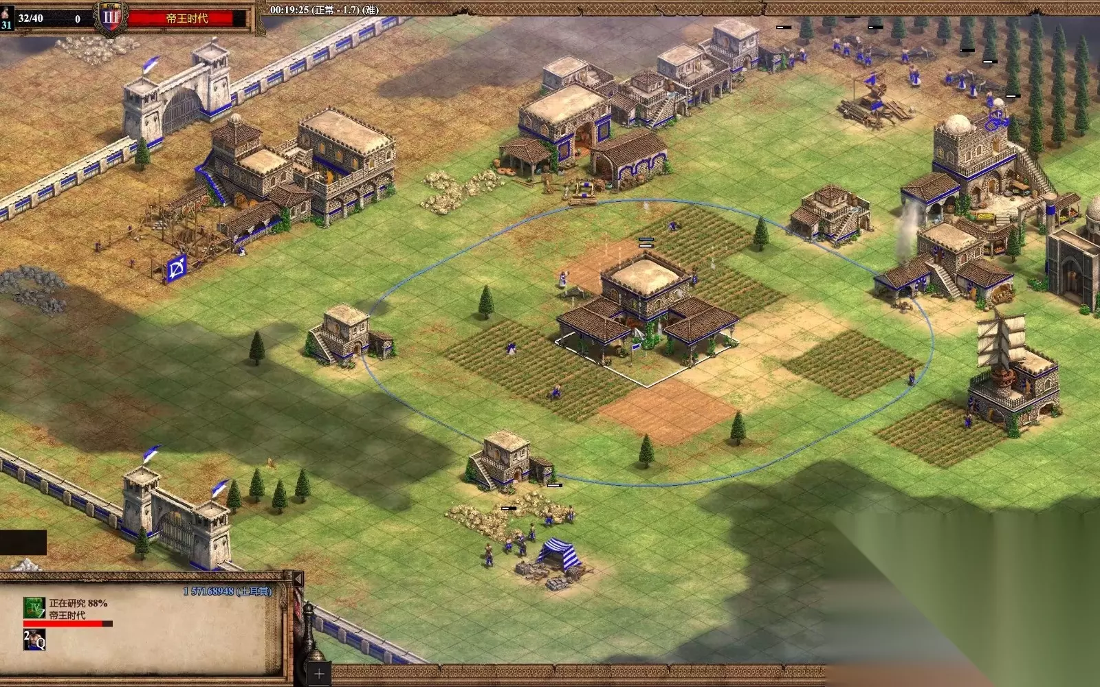 建筑布局初期应当围绕城镇中心展开建设,优先在附近建造房屋与基础资源建筑,将伐木场紧贴森林边缘,磨坊设置在鹿群或浆果丛旁,确保村民采集资源时移动路径最短。房屋应当排列成块状结构既能节省空间,又能形成天然屏障阻碍敌方侦察兵入侵,同时避免人口上限过早限制兵力生产。资源生产区需要集中规划,粮仓、矿场与伐木场尽量围绕城镇中心分布,外围则可布置箭塔或木栅栏作为警戒线。粮田最好以磨坊为中心向外辐射状排列,农民收割后仅需数步即可交粮,大幅提升食物积累速度。