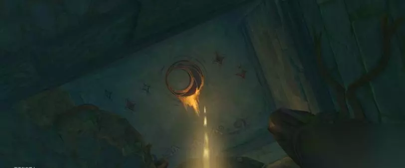 >>第一道石门前 壁画一 使用「羽毛」扫描印有雷鸟的墙壁,可打开墙壁。进入后往右走,进到小房间里将视角向上移,壁画在上面。