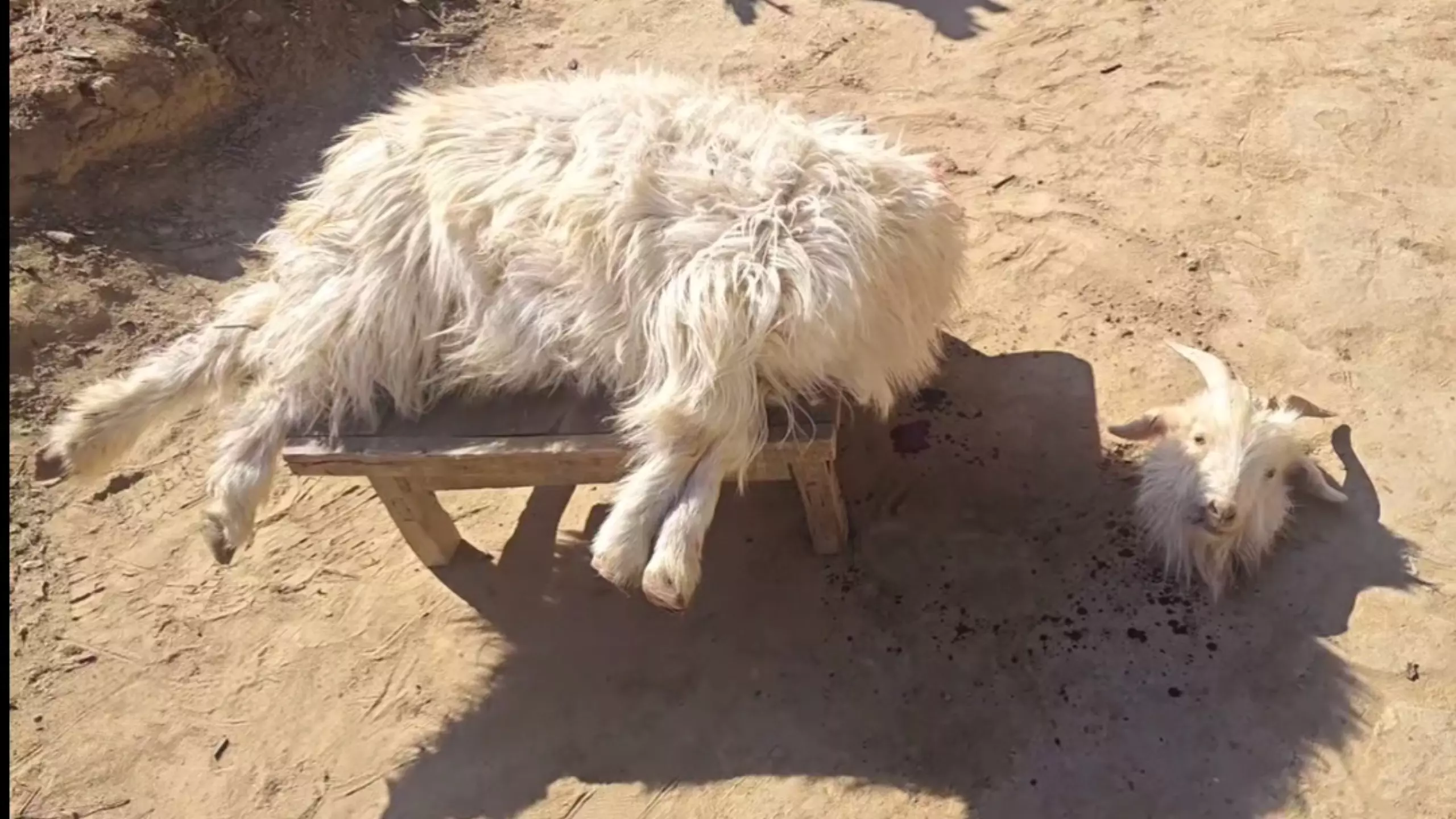 这篇帖子展示了多只山羊的不同状态,有头部卡在金属架上的山羊、被人互动的小羊、待在室外场地的山羊,还有被装在袋子里挂在车后的山羊,呈现了山羊的多样生活场景。