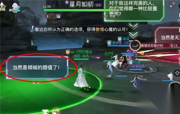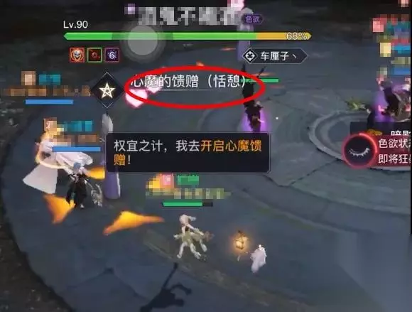 图片来自@彻之零的战斗录像 贪婪 BOSS中场进入无敌,并吸收洪荒之力,一共会产生6个方向的能量球,此时需要玩家们去撞球,防止心魔吸收到能量球壮大自身。 圣堂可以开减伤配上灵珑的治疗撞两到三个球,光刃可以利用破影无敌加自身血量撞两个球,剩下的队友根据自己血量进行判断,然后一人撞一个即可。 在撞掉六个球结束后,还会有一次全屏冲击波伤害。此时,灵珑注意撞球后的残血队友血量,避免减员。 色欲 BOSS会点名一个玩家,被点名的玩家开启心魔馈赠并进行换装,来满足心魔的愿望,BOSS此时结束中场无敌,可继续向他输出。否则等BOSS技能倒计时结束后,所有人会承受一次全屏伤害。 BOSS会产生四个馈赠,并且只有一个是对的,需要仔细地观察,然后被点名玩家去操作,去选择心魔的馈赠【恬憩】这件时装。 非点名玩家去开启心魔馈赠也会结束当前BOSS技能,但是会承受一次不必要的全屏伤害。