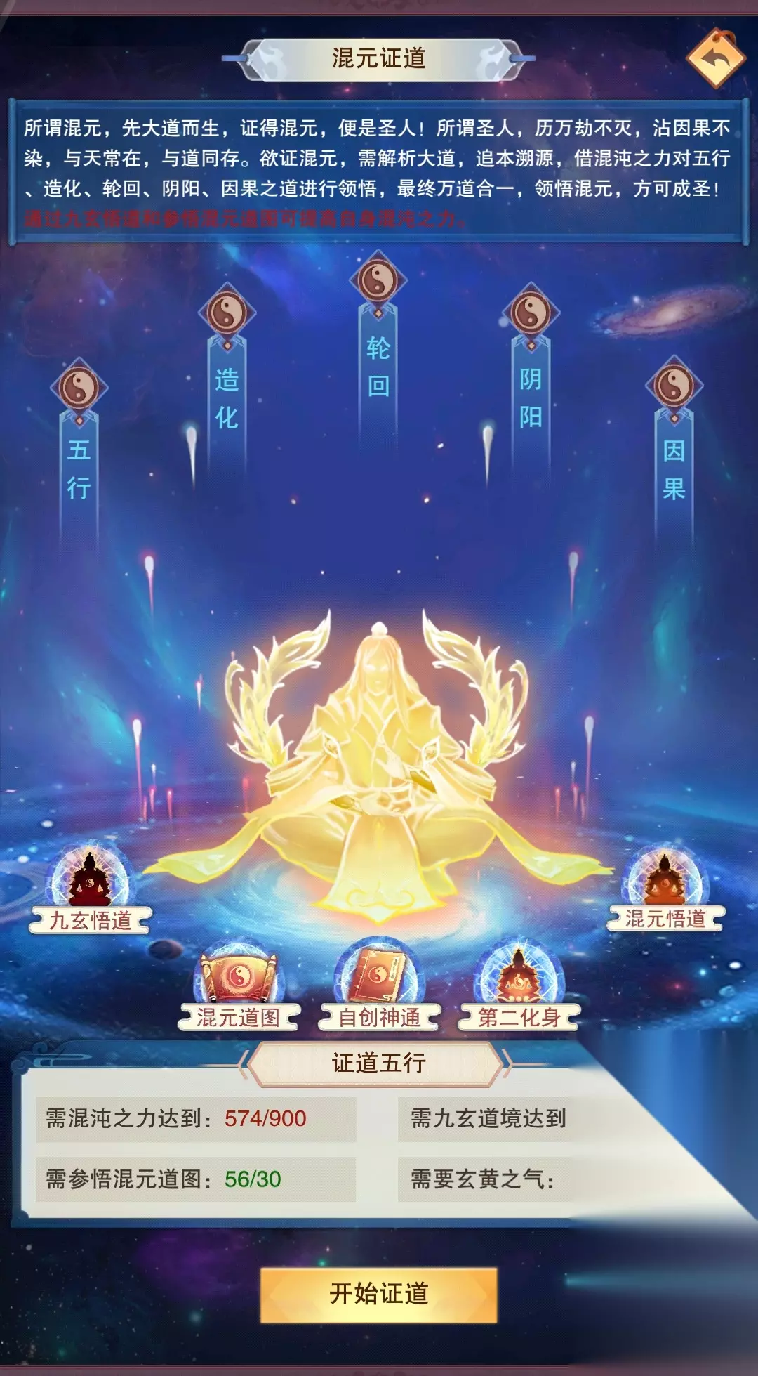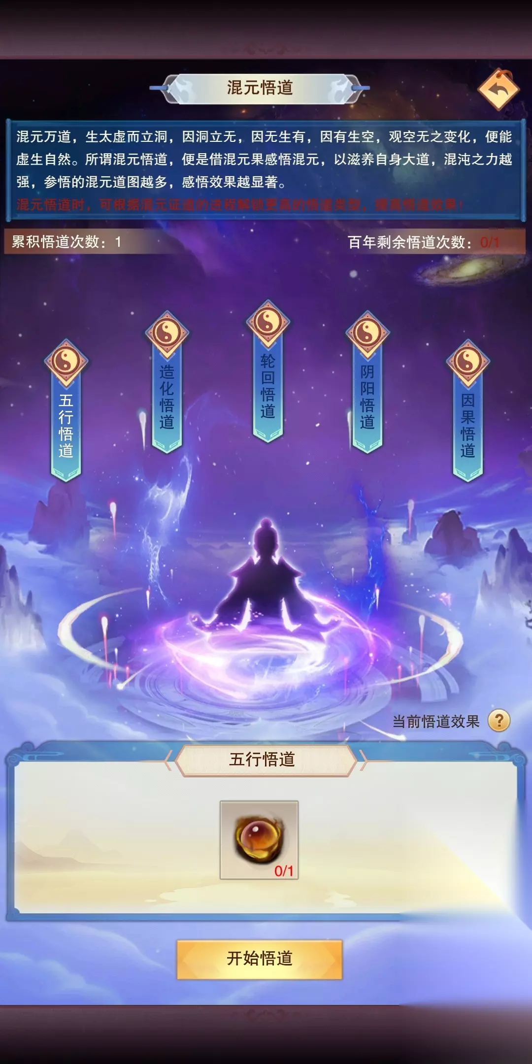 混元悟道:和喝茶类似,悟道需要玄黄珠,玄黄珠去玄黄祠(100玄黄之力)或者奇珍会购买(10上灵),悟道的效果受到混沌之力的多寡以及先天道图与混沌道图影响,先天道图的数量会增加悟道的防御增长数值,混沌道图的数量会增加悟道的攻击增长数值