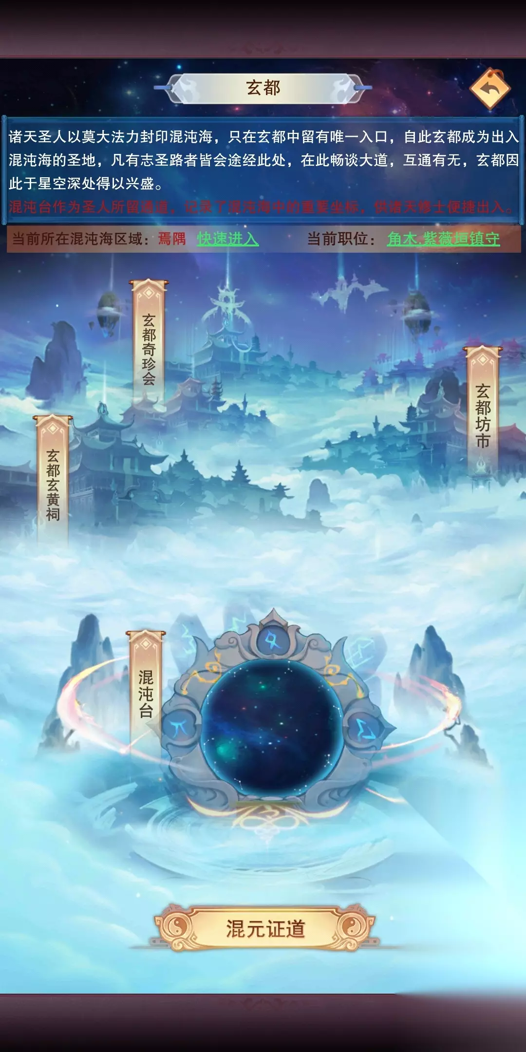 前言:本攻略分为两部分,第一部分为首日探索(即进混沌海第一天怎么玩),第二部分为功能介绍。一、首日探索通关玄霄天上英界后,花费一千愿力挑战玄都大法师,玄都大法师55攻击,挑战成功会送你十个增加混沌海探索次数的丹药,增加的次数仅限当日有效,所以建议看着用,不要第一天就全用了。进入混沌海后,先去玄都坊市把里面的三套道图都买了,一共需要三百万灵石(进混沌海之前要攒够,不然拖进度,如果是佛系玩家,可以不用在意),买完后去背包用了,然后进入混元证道,点击九玄悟道,点击悟道,之后退出来点击混元道图,把刚才买的道图都参悟了,这时你就有了5点混沌之力,最后去混沌台把角木海眼(低保)和紫晶湖开了,进入紫晶湖点通关挑战,然后出窍,位置如图所示