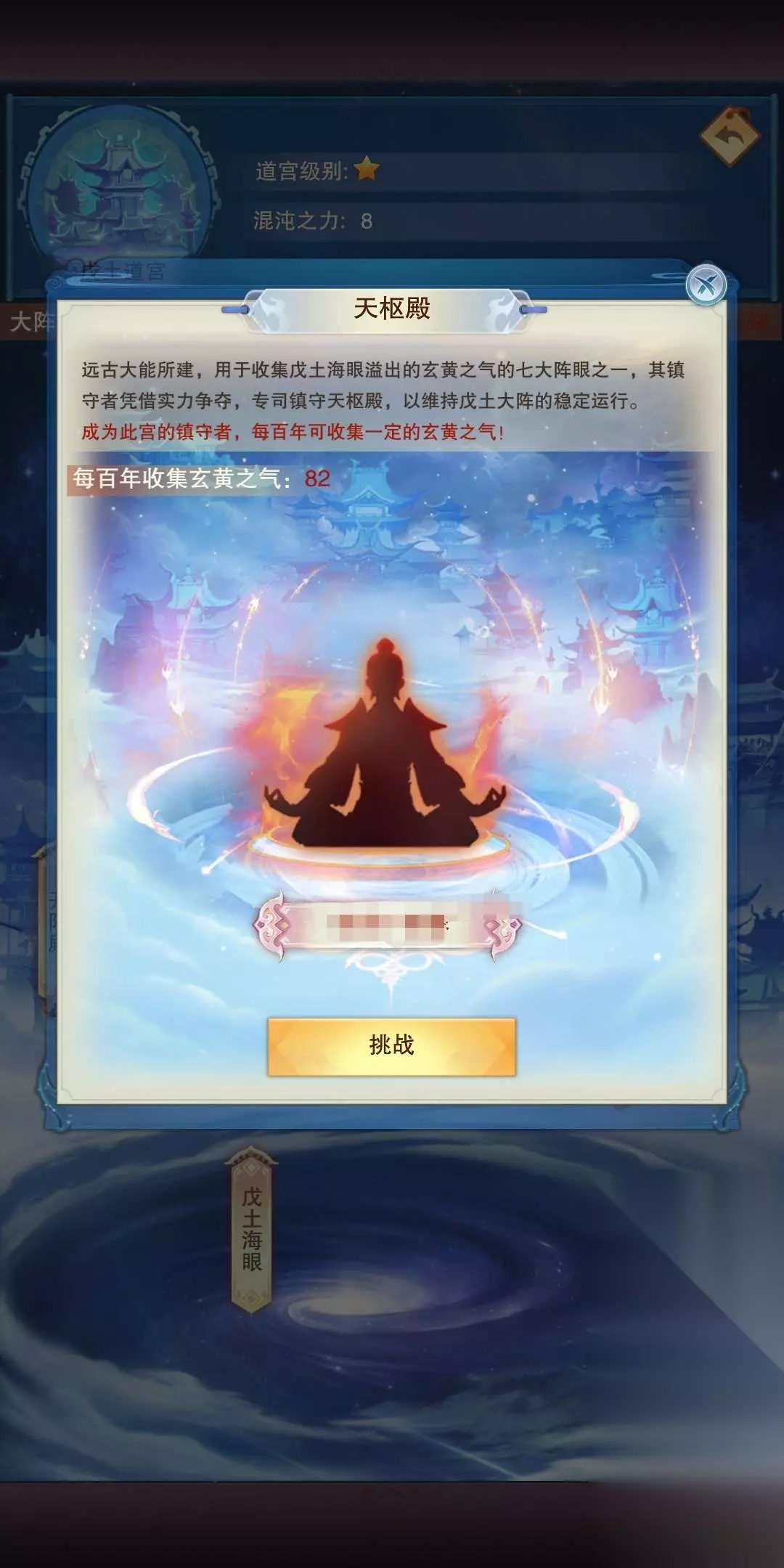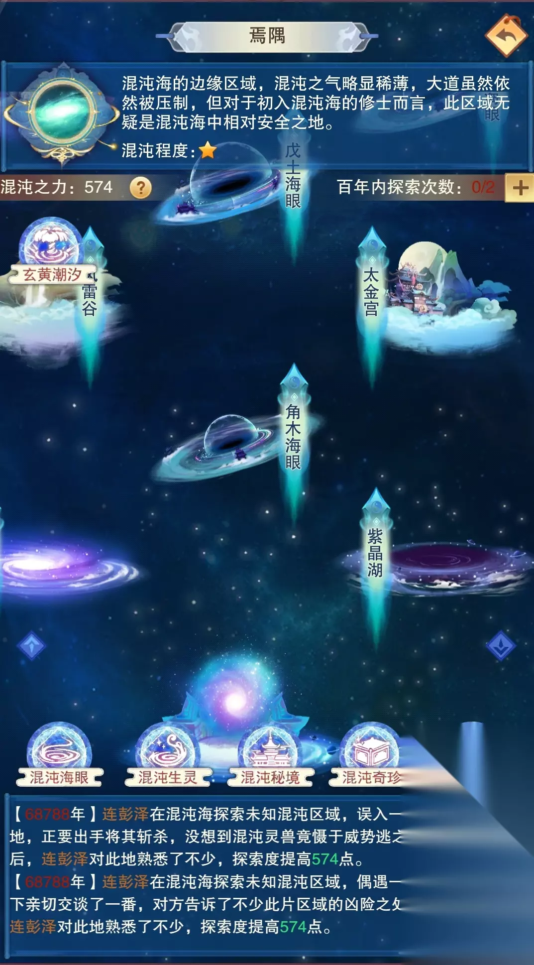 每个区域里分别有很多次级区域,这些区域分为混沌海眼、混沌生灵、混沌狩猎初次进入混沌海默认有两点混沌之力,可以靠混元证道提升混沌之力,如无必要请勿探索高于自身混沌之力的区域,探索高于自身混沌之力的区域,探索度为自身混沌之力的1/3,除不尽则向下取整,如17点混沌之力,探索30点混沌之力的区域,探索度为5,探索低于或等于自身混沌之力的区域,则探索度等于自身混沌之力混沌海每天会得到2次免费探索次数(如果玄都奇珍会购买了定元丹,就会得到永久性的探索次数+1,达到每天3次免费探索次数)然后可以额外购买2次(有定元丹就3次)探索次数,购买一次探索次数花费100玄黄之气或者10上灵。“准帝仙”会天生自带3次免费次数,氪个丹会达到4次(并且每天可额外购买次数也是4次)建议把当天的混元证道(道图参悟、升级,九玄悟道破境)全部进行完再探索,这样能使探索效率达到最高混沌海眼