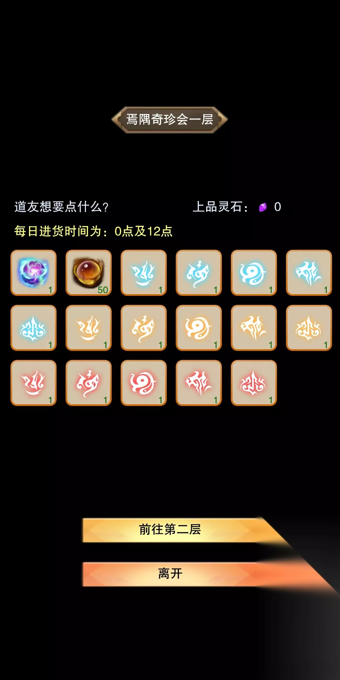 玄都奇珍会:玄都奇珍会1层,固定出售3套先天道图,2层随机出售5套先天道图。随机的意思就是随机出现那5套的道纹,花几天时间全部买齐,就是合计8套氪金道图(每套5个道纹。每个道纹50上灵,所以每套道图250上灵,8套合计2000上灵),如图,奇珍会第一个是定元丹,售价一百上灵,永久增加一次每天探索次数。