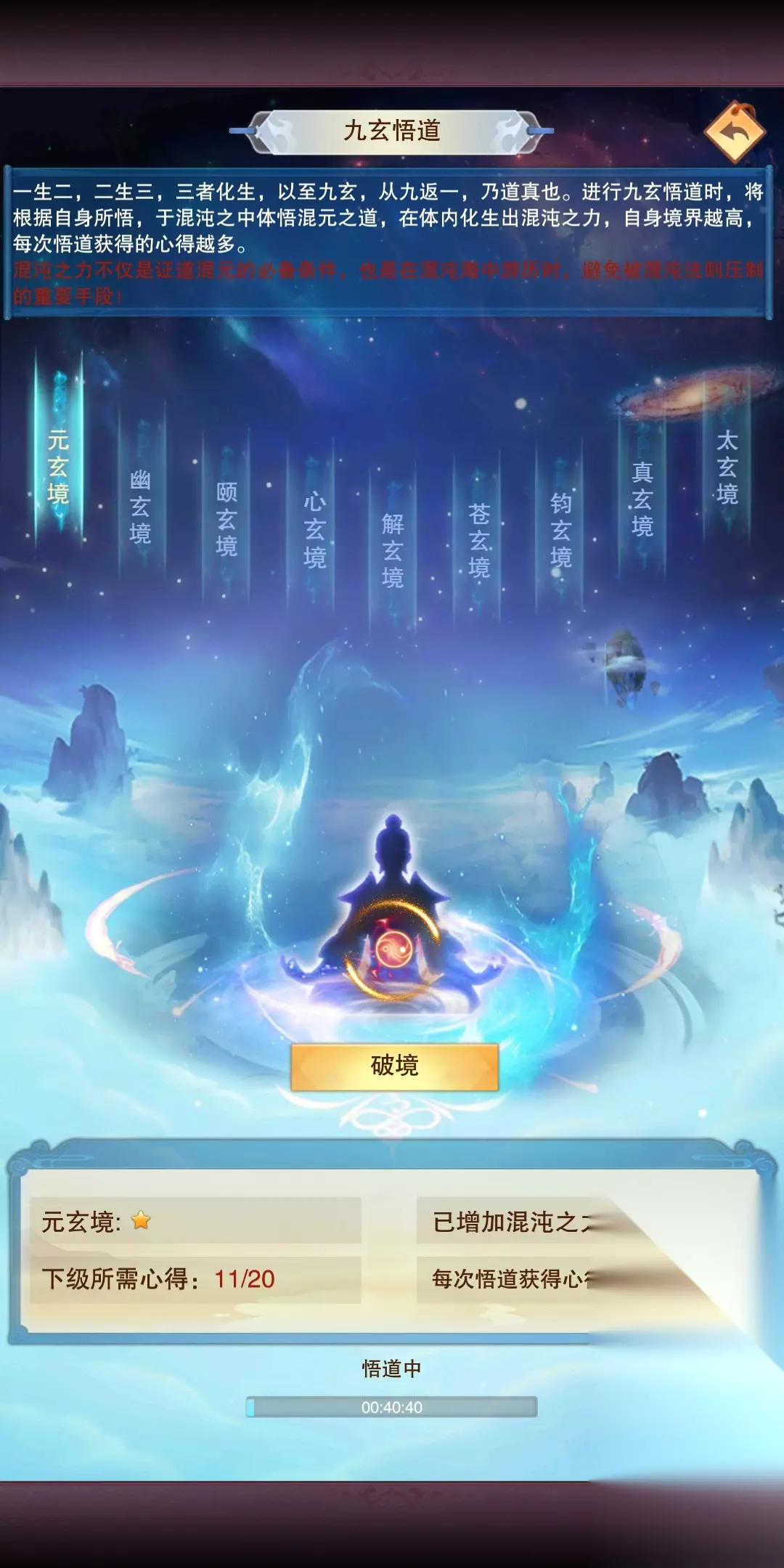 九玄悟道:悟道的收益看境界,玄仙1是每24小时11心得,仙君1是21心得,仙尊1是31心得,准帝仙1是41,帝仙是51,如果你是玄仙10,那么悟道心得就是20,以此类推。心得足够可以点击破境,每次破境会增加2点混沌之力