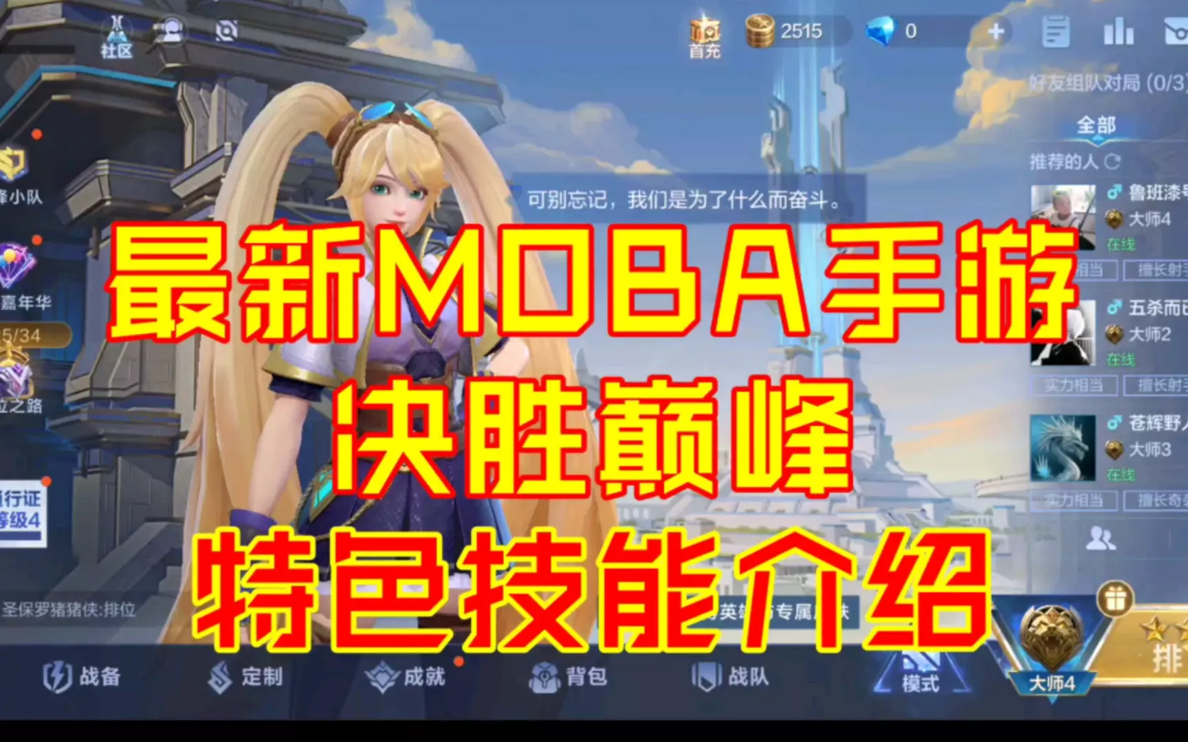 这是决胜巅峰里一拳超人的对局日常,本局对线桂妮薇儿,分享了对局思路:清完兵线可看情况开大招支援,遭遇敌方打野时避其锋芒,团战扛伤也不易被秒,展示了一拳超人的实战对局过程。