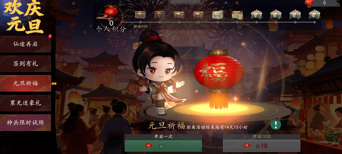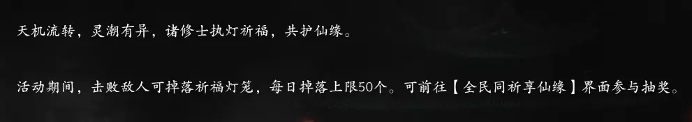 ■活动介绍:活动期间,游戏内击败敌人,即可获得祈福灯笼,通过游戏内上方「活动」按钮进入,选择「元旦祈福」,即可在页面中消耗灯笼参与元旦祈福,祈福可获得祈福奖励与个人积分,个人积分可在页面上方领取更多奖励哦。