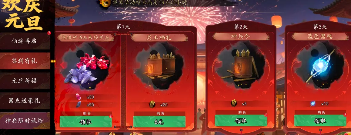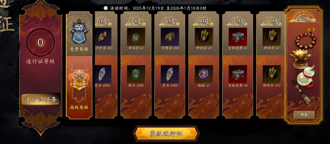 ■活动介绍:通过游戏内上方「通行证」按钮进入,可进入元旦专属通行证活动,点击「通行证任务」并完成对应任务,即可获得通行证经验,购买高级通行证可以获得更多经验,领取更多奖励,本次奖励中将包含玄机宝匣,可以通过打开宝匣获得4种限定法器。
