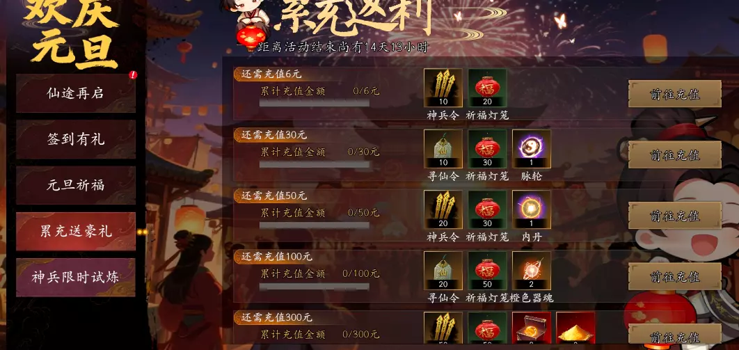 ■活动介绍:活动期间,在游戏内进行任意充值,都可以计入累充返利,包括:通行证、月卡、终生卡、商人执照、折扣礼包等等;