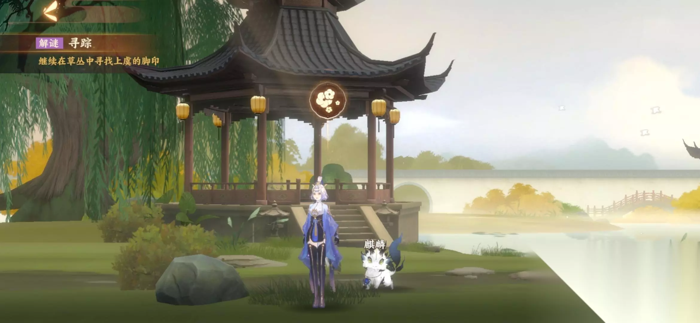 【五.探索附近的草丛×4】 接下来就是找鹅的踪迹,一共要找四次,位置是从右往左走。 第一个草丛在王羲之的右下方,第二个在左下方,第三个往左挪一点(找不着见图),第四个最左边的石头旁的草堆。