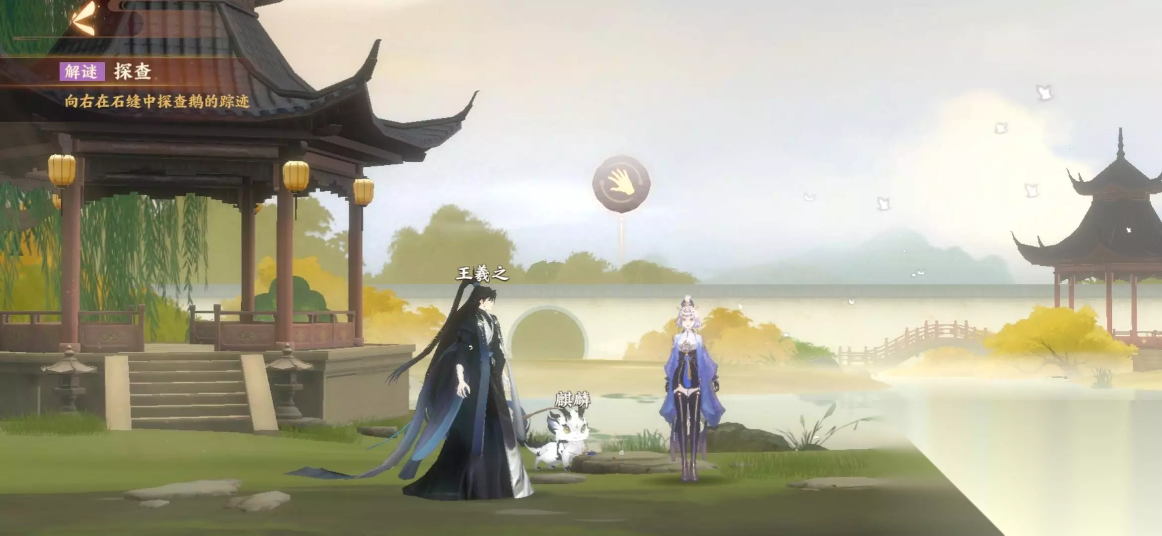 【二.向右在石缝种探查鹅的踪迹】 过对话,往右走一点,探查靠近王羲之右边的石头。