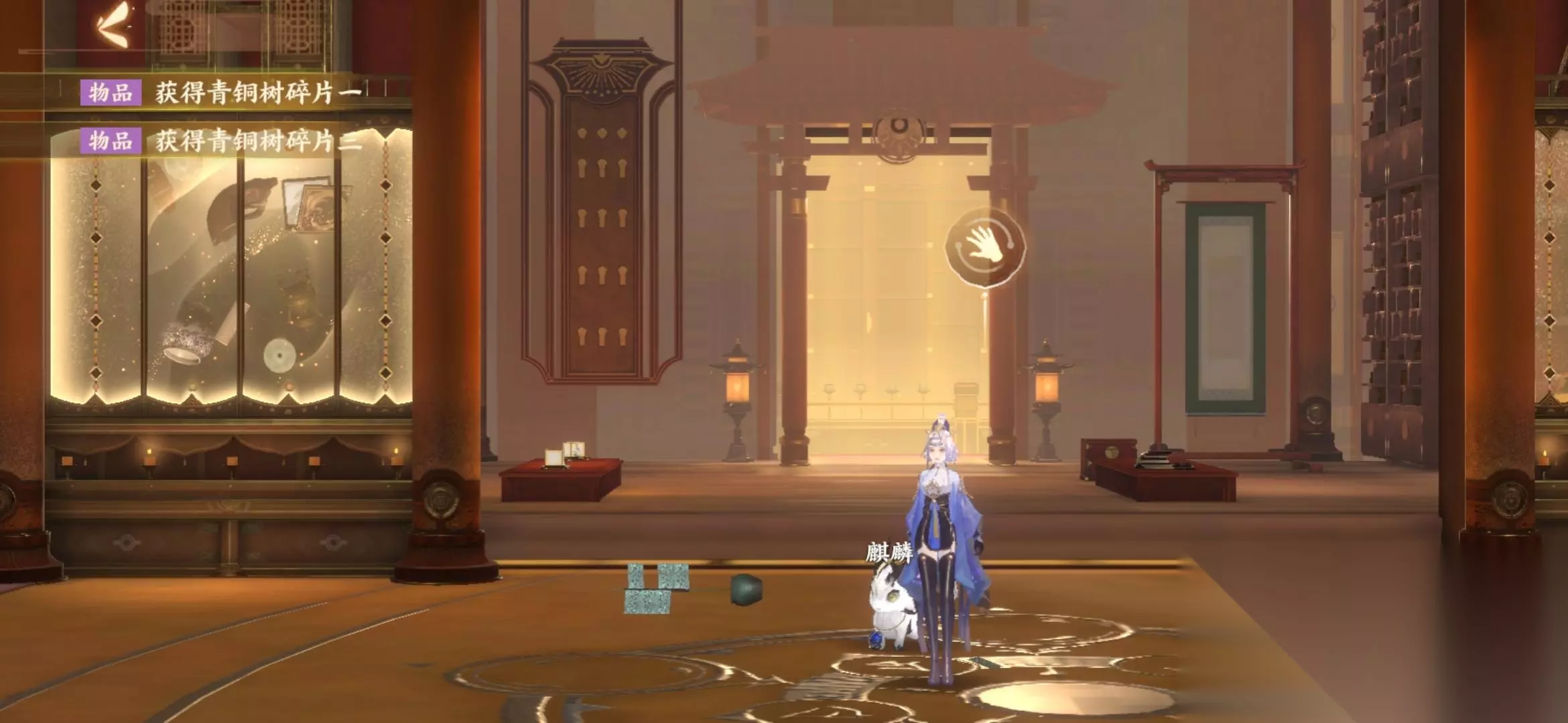 【六.找完了出现个发光的地块,走过去换地图,过对话,找三个青铜碎片】 青铜碎片一:对话完往左走,往自己方向再走走,靠近地毯圆形图案的左边(如一图)。 青铜碎片二:往左走,再往里走点。走到左边那个类似玄关的右边柱子下(如二图)。 青铜碎片三:再往里走,那有个门的地方(过不去),前面有个小箱子,碎片在它左边的地上。